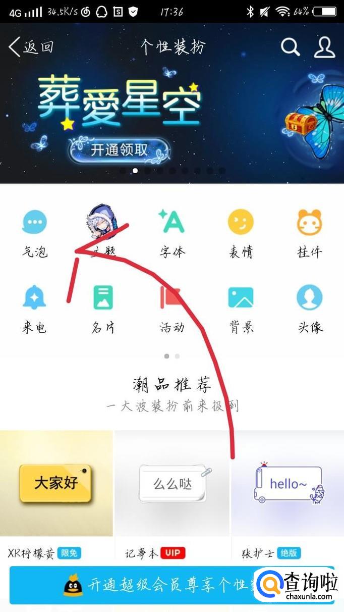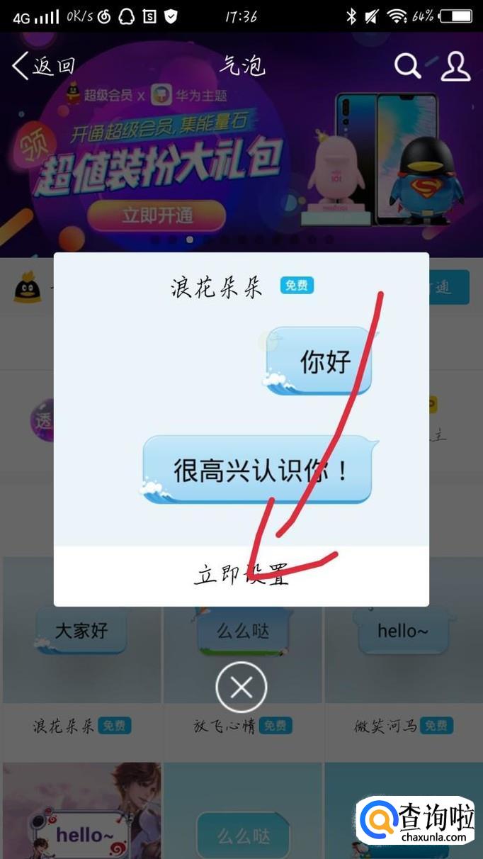 点击“气泡”选项,如图1箭头所示。会出现一个新的界面,选择自己喜欢的气泡,点击。再点击“立即设置”选项,如图2箭头所示