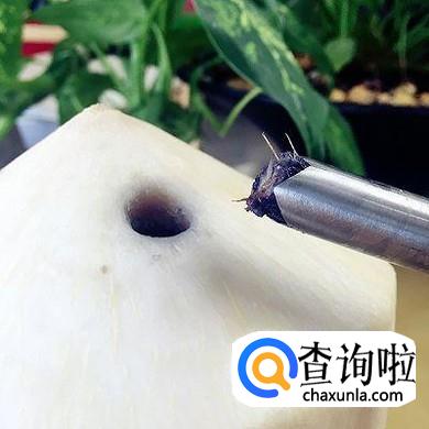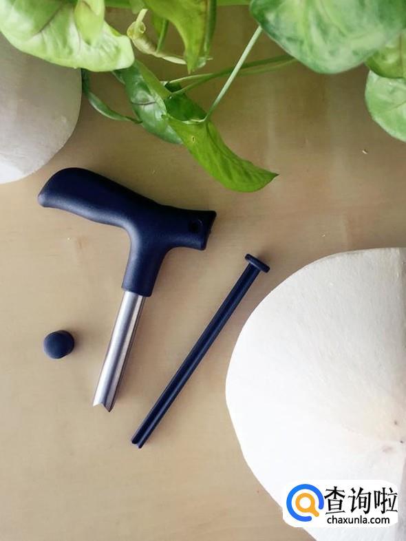 用另外一个比较细的手柄插入金属管,把卡在管子里的椰子壳戳出来。