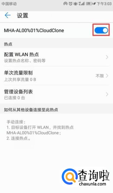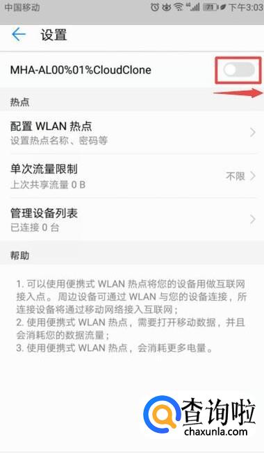 然后我们将热点的开关向右滑动打开,这样我们就共享了我们手机上的移动网络了。
