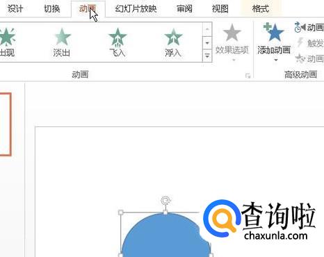 鼠标选中圆形;再点动画选项卡,展开与之相关的功能区。