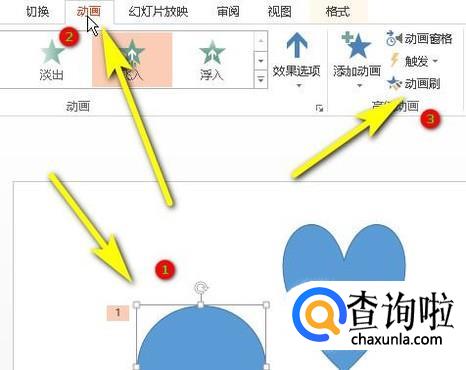接下来,要给心形添加与圆形一样的动画效果。那么,我们用动画刷来刷动画效果。鼠标点击圆形,再点动画选项卡;再点:动画刷