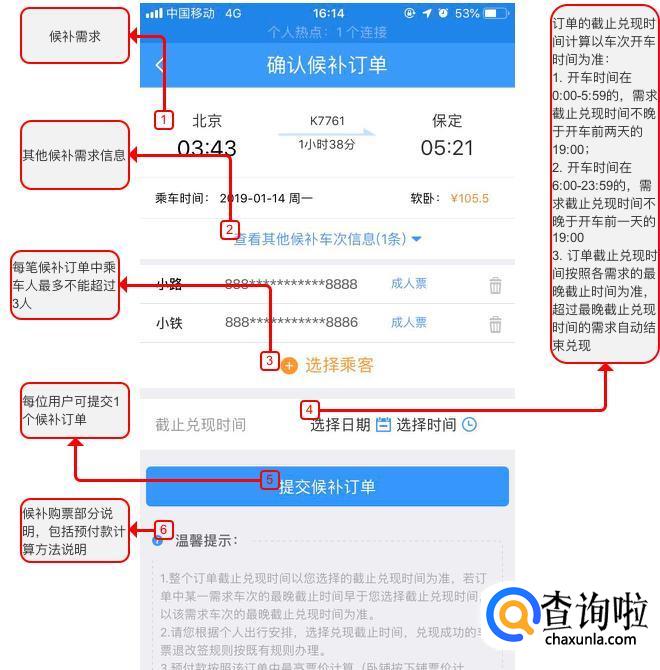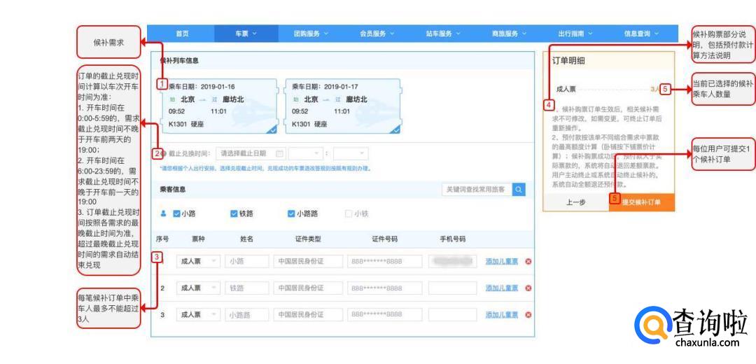 每位用户可提交1个候补订单,1个订单中可添加发到站相同(可以是同城的不同车站)的2个相邻的乘车日期。