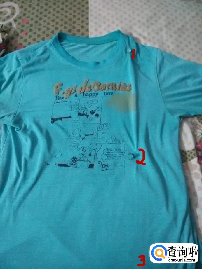 先把衣服平铺在床上,为了讲清楚,在衣服上面标了1、2、3三个点。