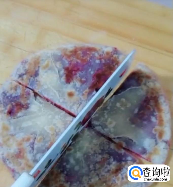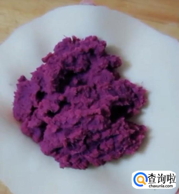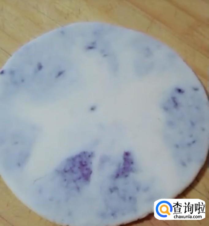 早餐紫薯煎饼,准备面粉,加入开水烫面,揉成光滑的面团,醒一会儿,紫薯上锅蒸熟,压成泥,加入一勺白糖,少许牛奶,拌匀。醒好的面,分成大小均匀的剂子,擀成薄片,包上紫薯馅,再擀薄,煎至两面微黄,切块装盘就可以了。