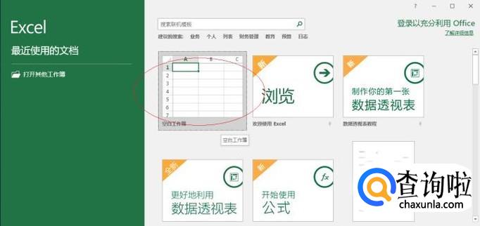 启动EXCEL 2016电子表格软件,点击"新建空白工作簿"图标。