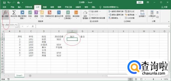 选中统计单元格数据区域,点击"公式→函数库→插入函数"图标。