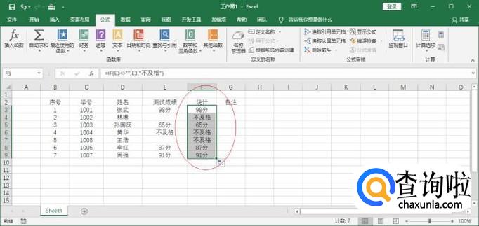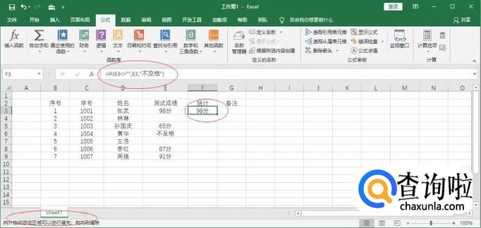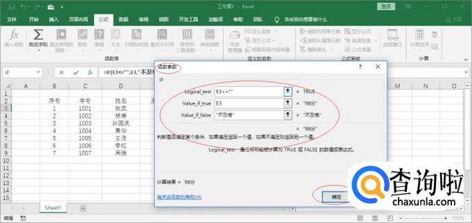 函数参数文本框输入函数参数,完整公式为"=IF(E3<>"",E3,"不及格")"。