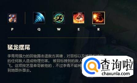 R技能:r技能叫做猛龙摆尾,是一个非常霸气的名字,这个技能可以将敌人击退和眩晕,并且可以击飞敌人在同一线上面的队友,r使用的好可以瞬间给敌方5人造成伤害。