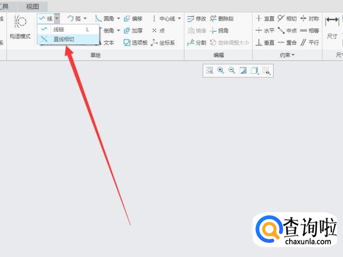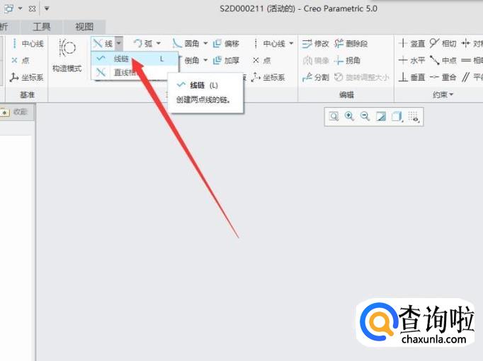 进入草绘界面之后,在菜单区里找到线选项,点击在其下拉菜单里找到线链选项,如图所示。