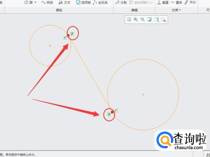 移动光标,使光标定在另一个相切的圆上,这时圆会呈现绿色,点击鼠标左键即可使其相切,如图所示。
