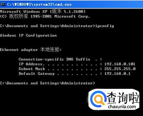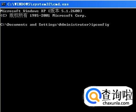 这时就会出现命令行对话框,在闪烁的光标后输入“ipconfig”,回车。