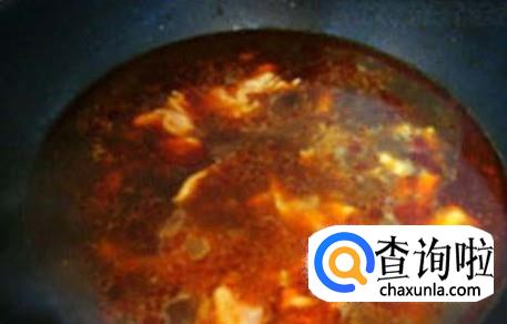 接着将鸡汤倒入锅中,煮至沸腾后倒入好人家水煮鱼调料包,边煮边搅拌,煮5分钟。