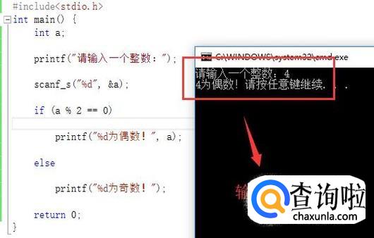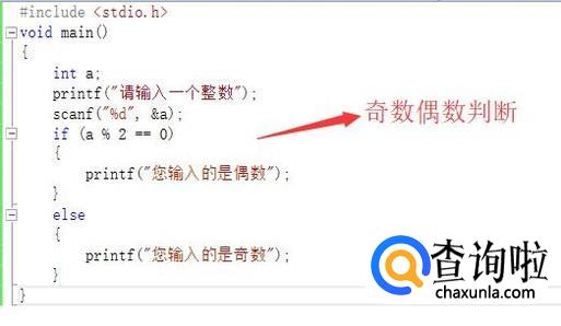 接下来我们在主函数中实现奇数和偶数的判断,如下图所示,通过scanf先让用户输入一个数,然后将这个数和2进行取余,余数为0的是偶数,否则是奇数