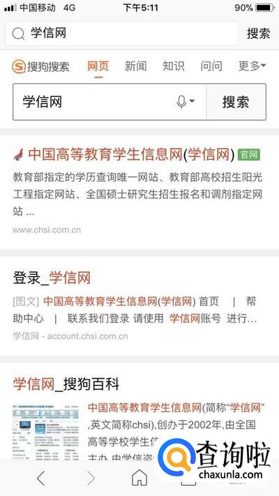 首先我们先使用搜狗浏览器搜索学信网 ,然后点击中国高等教育学生信息网官网,进入学信网。