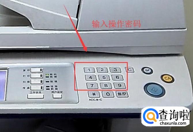 首先把复印机连上电源,输入操作密码,如下图所示