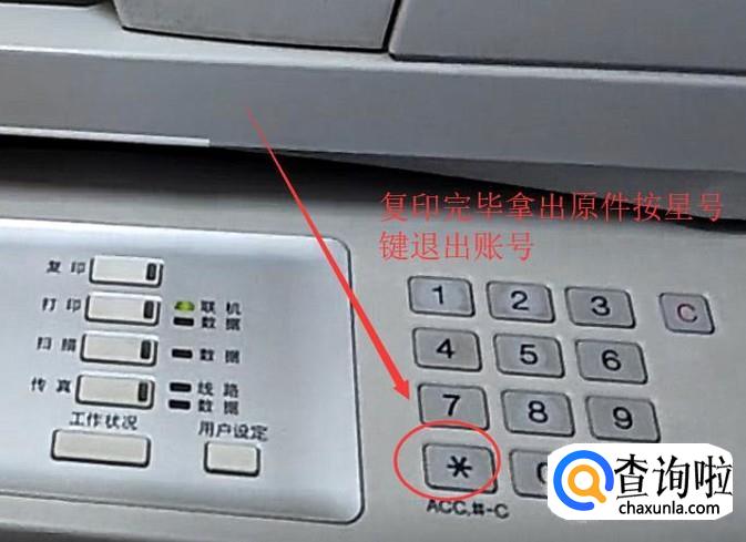 复印完毕之后,打开盖板取出原件,接着按星号键退出账号,如下图所示