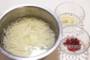 土豆丝用冷水洗一遍后,准备一些材料,蒜,干辣椒,糖,醋,把这些材料都切好,准备下一个步骤!