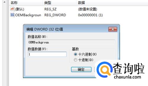 在注册表编辑器窗口左侧,按照路径打开目标文件夹LogonUI下的Background文件夹,,鼠标双击OEMBackground出来个对话框,将数值数据输入为1,然后关闭注册表编辑器。