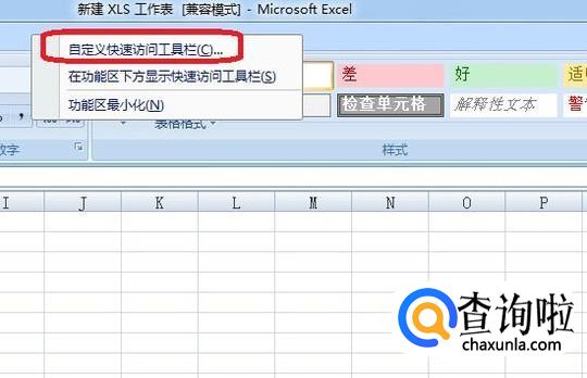 右键单击菜单栏右侧空白处,如图所示,选择“自定义快速访问工具栏”。