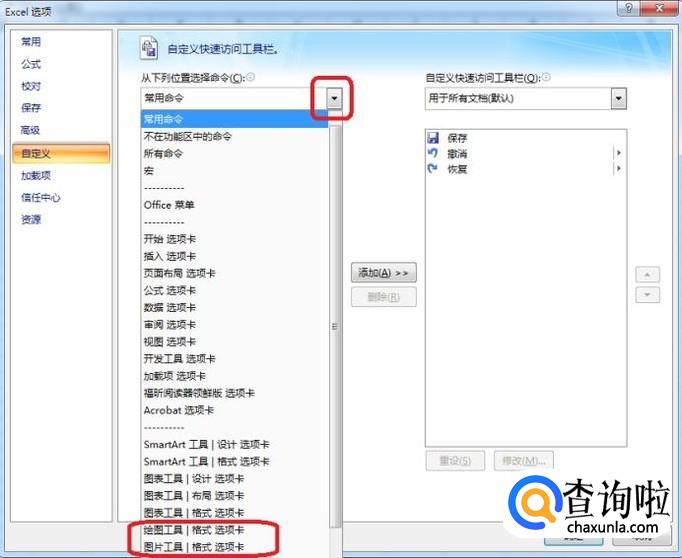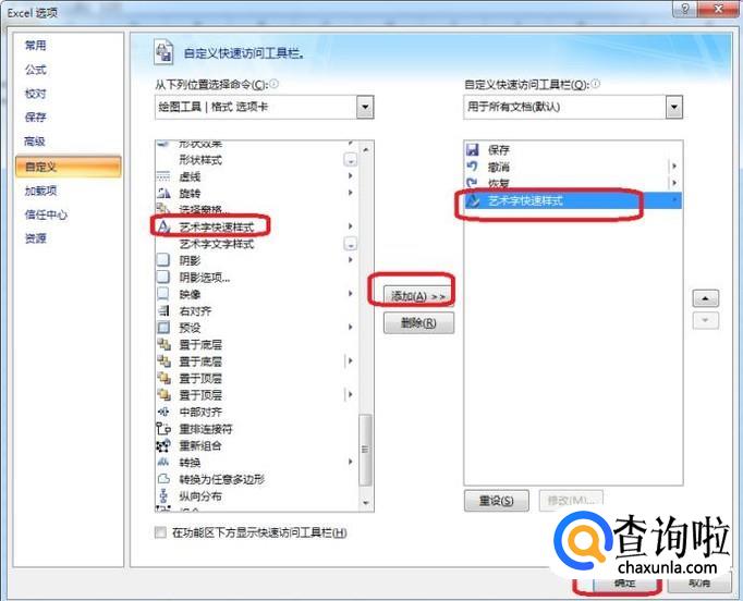 就可以看到“绘图工具”选项卡下所有命令,我们只需选择命令,然后点击“添加”,点击“确定”就可以添加到工具栏,如图所示。