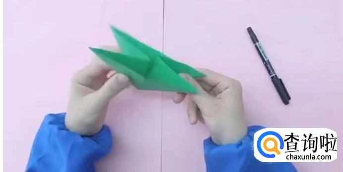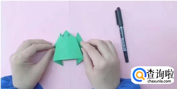 将纸翻过来,打开一侧纸向内折出青蛙的后腿,再对称折出另一侧的青蛙后腿。