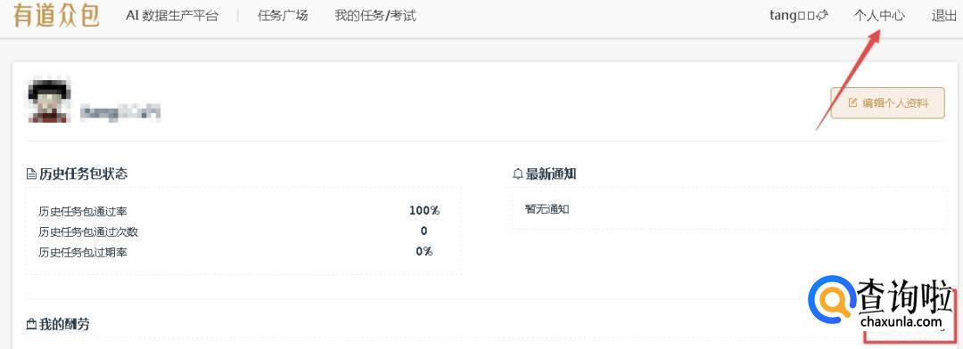 点击页面右上角的“个人中心”,我们就可以看到你挣的钱数了。