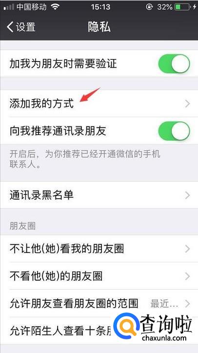 打开隐私后我们就会看到添加我的方式,点击进去。
