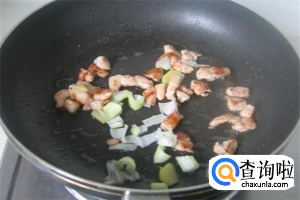 将切好的青红椒丁和菠萝丁加入翻炒,倒入些许盐和生抽和香油和蚝油。就可装盘了。