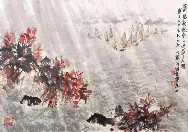 这首词一开始就给人们展现出雄浑壮阔的自然景观。“大雨落幽燕”一句排空而来,给人以雨声如鼓势如箭的感觉;继之以“白浪滔天”,更增气势,写出浪声如雷形如山的汹涌澎湃,“大雨”、“白浪”,一飞落,一腾起,相触相激,更兼风声如吼,翻云扫雨,推波助澜,真是声形并茂气象磅礴。