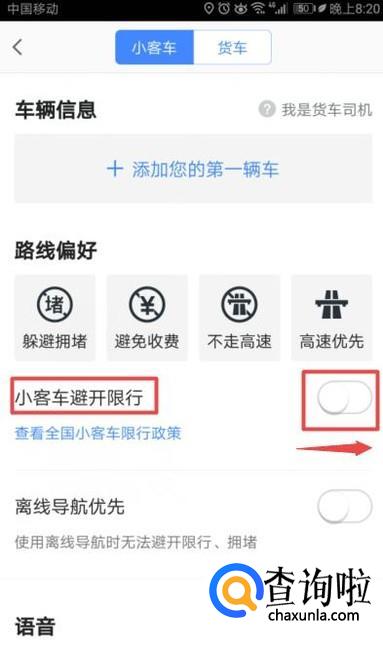 之后我们将小客车避开限行的开关向右滑动;