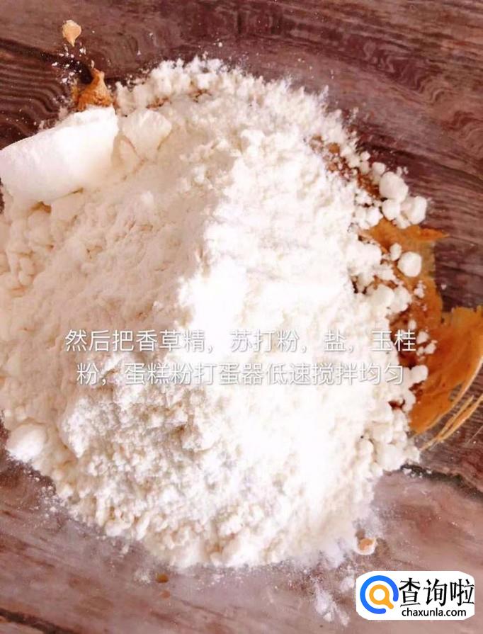 接着把香草精,苏打粉,盐,玉桂粉,蛋糕粉一起倒入碗中,用打蛋器搅拌均匀,如下图所示。