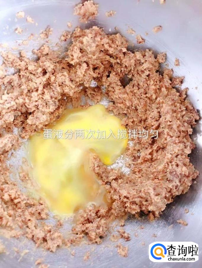 然后把蛋液分两次加入搅拌均匀,如下图所示。