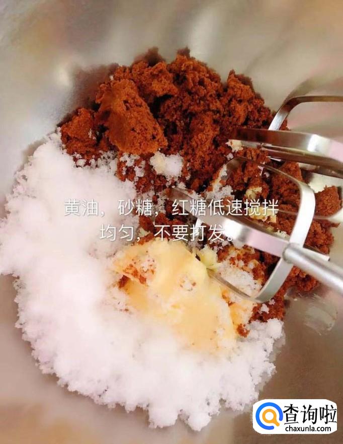 首先将黄油,白砂糖,红糖倒入盆中用打蛋器低速搅拌均匀,如下图所示。小贴士:注意千万别打发了。