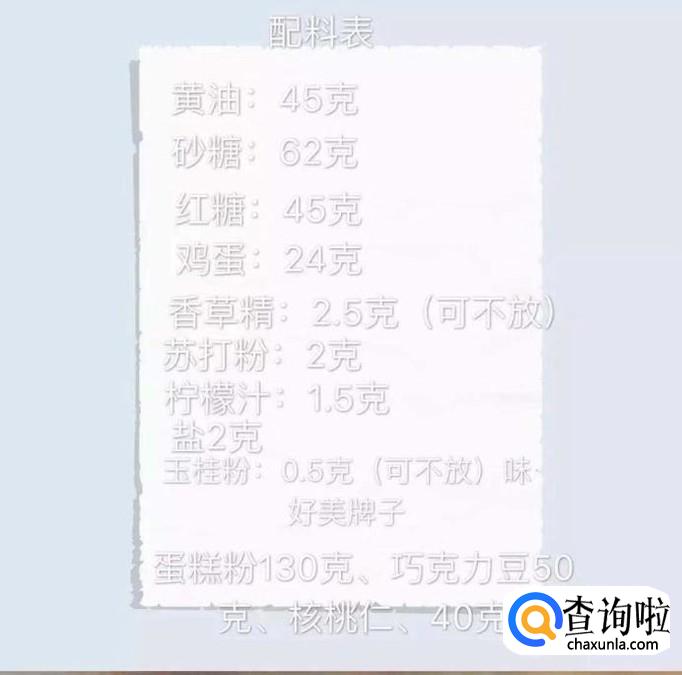 食材:还油45克,白砂糖62克,红糖45克,鸡蛋24克,香草金25克,苏打粉2克,柠檬汁1.5克,盐2克,玉桂粉0.5克,蛋糕粉130克,巧克力豆50克,核桃仁40克。
