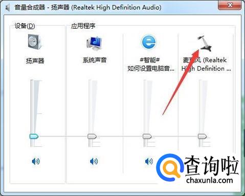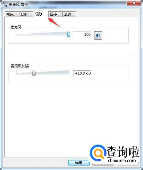 在音量合成器中点击麦克风,弹出麦克风属性对话框。点击级别可设置麦克风的音量级别及加强。
