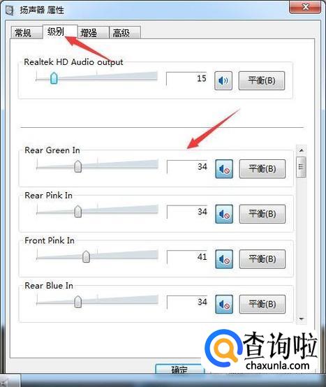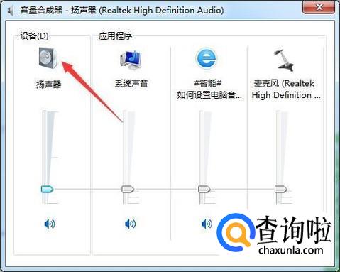 弹出音量合成器,点击扬声器。弹出扬声器属性对话框,点击级别,这里可以调节各项输入的音量大小,和输出的音量大小。