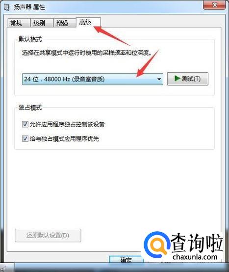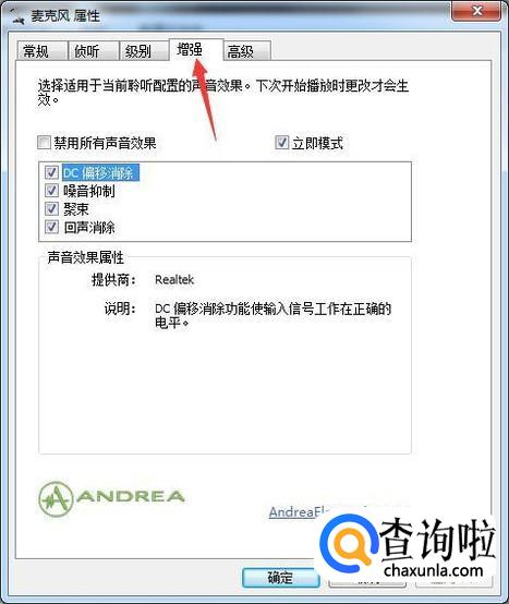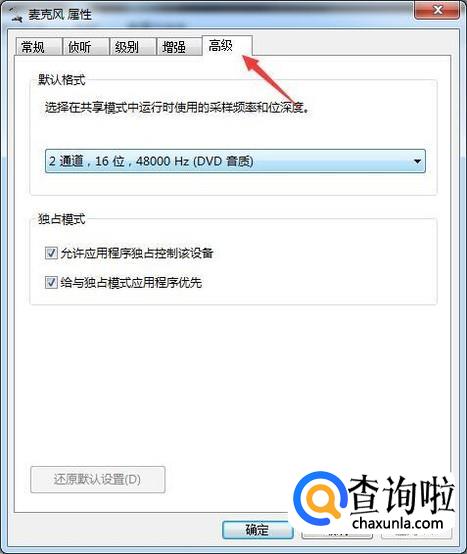 点击增强,可勾选需要的效果。点击高级可设置麦克风的采样频率和位深度。