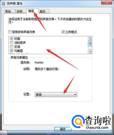 点击增强,可勾选需要的效果,如消除原声等,还可设置音响所处的环境,如房间。点击高级,可选择采样频率和位深度。