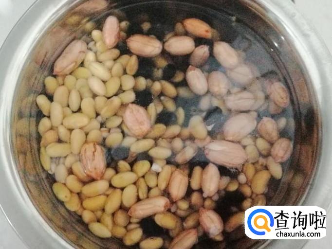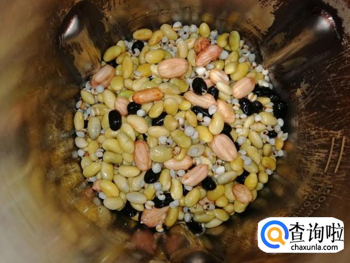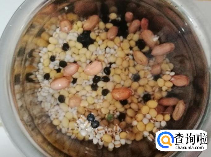 把准备好的黄豆、黑豆、花生、薏米用清水洗净,提前用水泡发,一般早晨打豆浆的话,晚上泡好豆子备用。