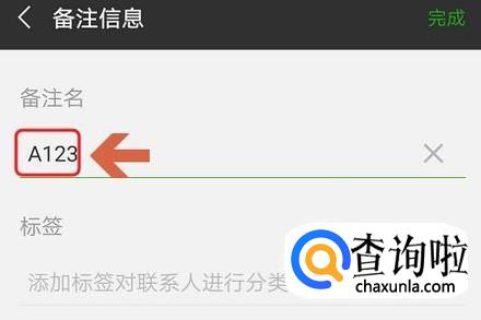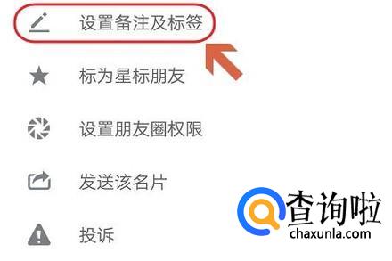 点击这个图标,就会在页面下方弹出一个窗口,我们选择其中的“设置备注和标签”,然后在备注名的地方输入AXXX这样的名称,比如A123;