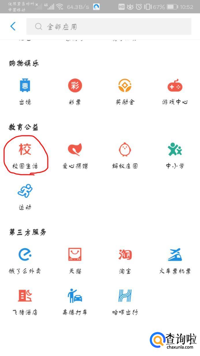 在此界面找到教育公益下面的“校园生活”。若是中小学则点击“中小学”。