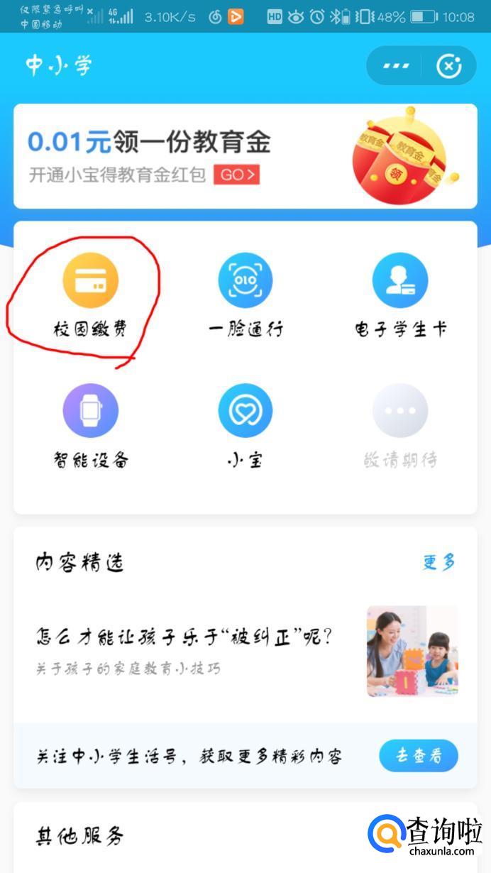 点击“更多”。进入界面,点击“缴费大厅”。若是中小学,点击进入界面后直接点“校园缴费”,然后根据屏幕提示操作即可。