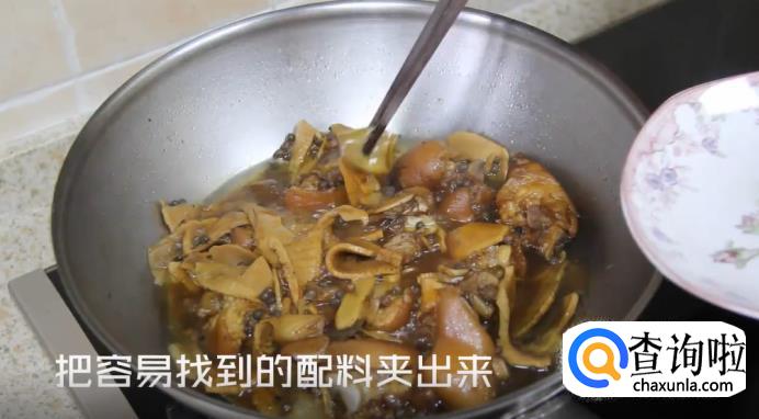 煮得差不多的时候,打开锅盖,把容易找到的配料夹出来,再撒入适量食盐搅拌均匀,开大火将其收汁。