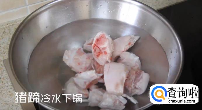把切好的猪蹄冷水下锅,盖上锅盖开大火煮,煮开之后将猪蹄捞出。