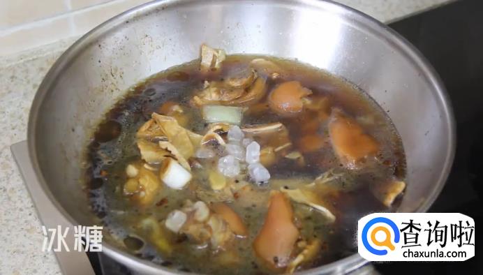 倒入冬笋,跟锅里的食材一起翻炒。翻炒均匀后,加入适量的清水,再撒入冰糖,开大火烧开后转小火再煮90分钟。