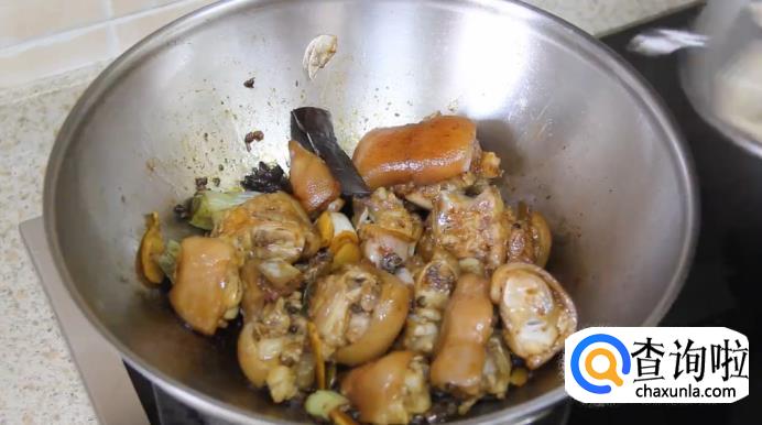 然后将猪脚倒进去,再加入老抽、生抽、料酒一起翻炒,直至猪蹄上色。