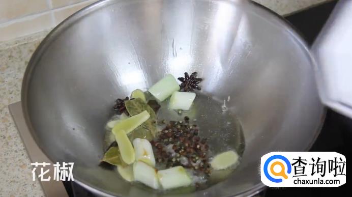 另起一锅,开到中火热锅,放入食用油,油热后放入切好的生姜和大葱,还有桂皮、八角、香叶、花椒,翻炒一下。