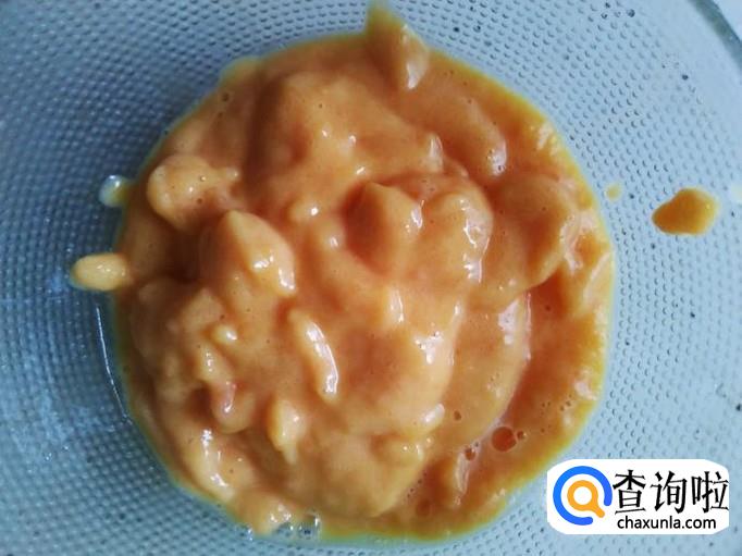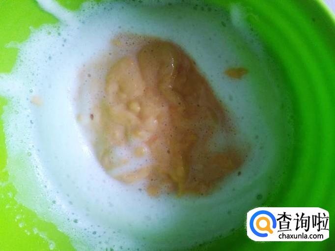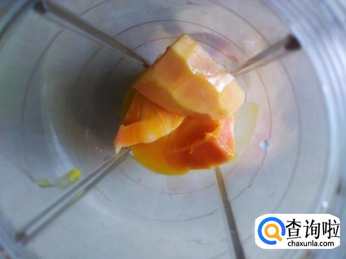 木瓜去皮去籽,然后把一小半木瓜切成几块放到到蛋黄里。