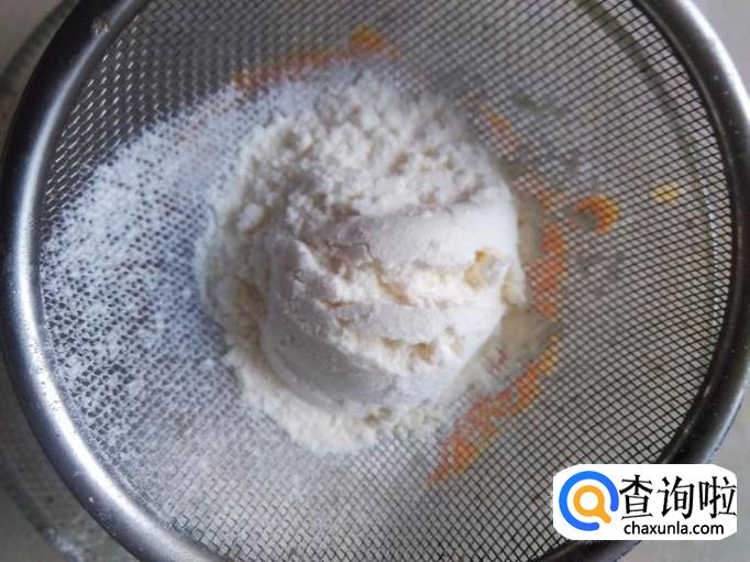 木瓜蛋黄酱倒到碗里,用过滤器把50克的面粉筛进去搅拌均匀。