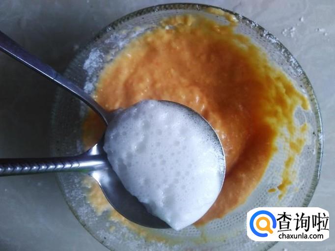 加2勺蛋清泡沫进去搅拌均匀,再把木瓜酱倒到蛋清泡沫了搅拌。
